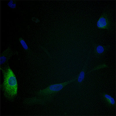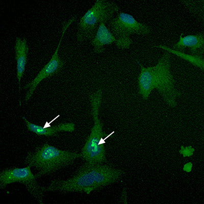 In control cells (left panel), the green staining indicates that NRF2 remains largely in the cytoplasm (arrows) without much protein located in the nucleus, which is counter-stained in blue. When cells are exposed to sulforaphane and Maitake (right panel), NRF2 moves to the nucleus (arrows) where it can bind to DNA to turn on expression of certain Phase 2 enzymes.